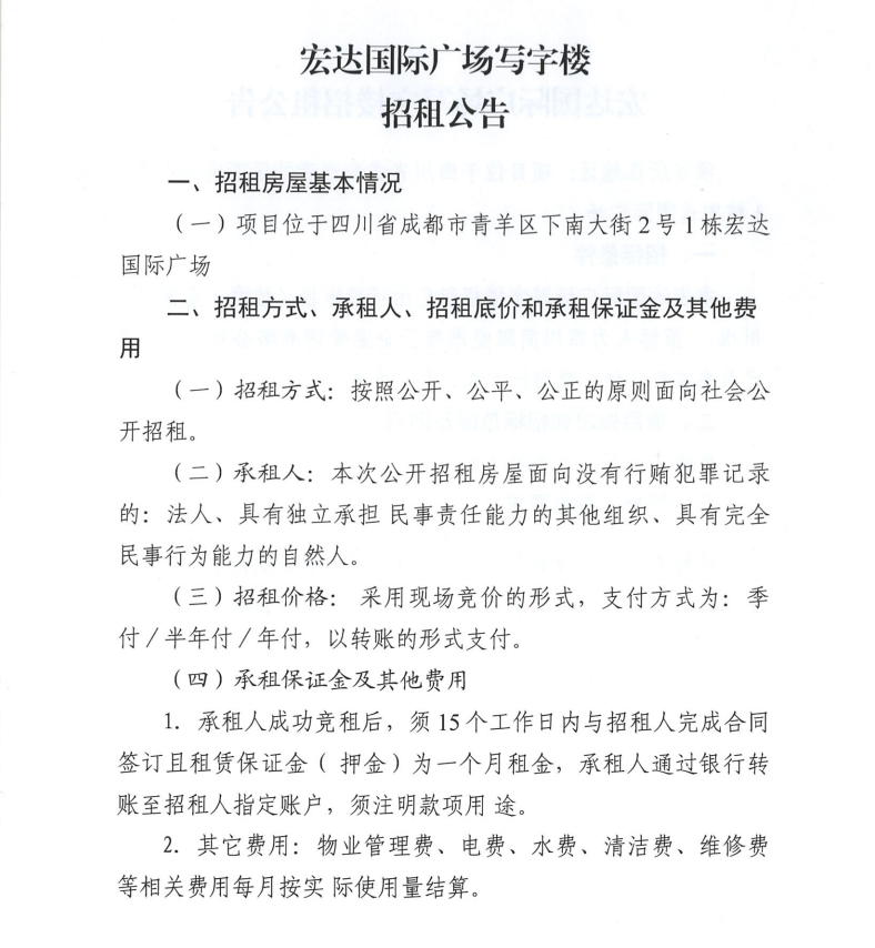 宏达国际广场写字楼招租公告