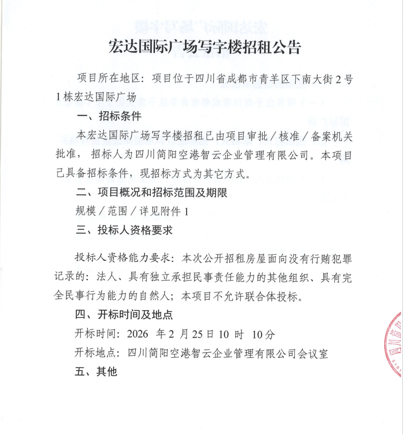 宏达国际广场写字楼招租公告